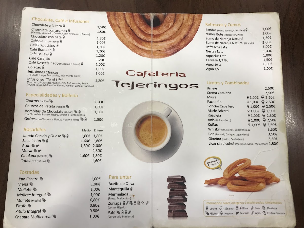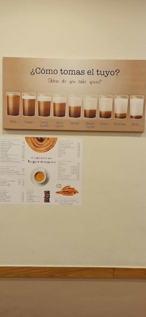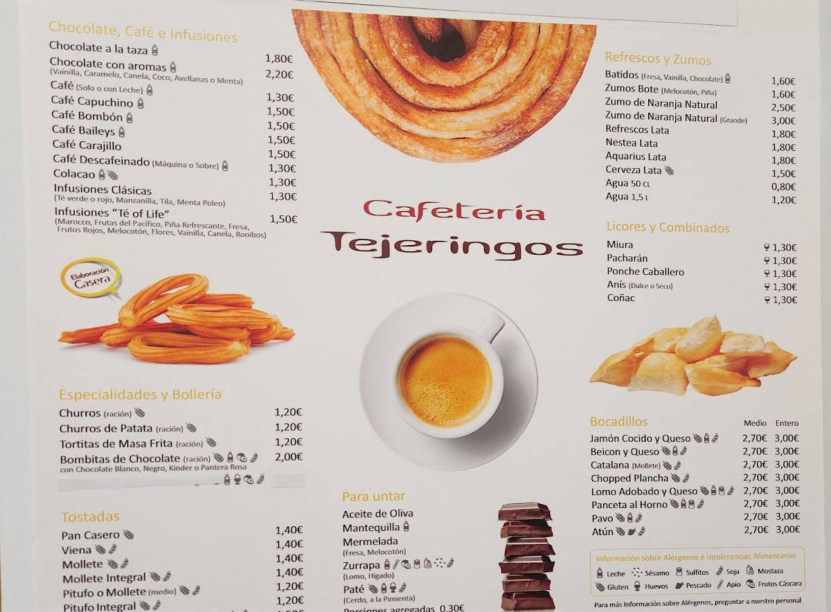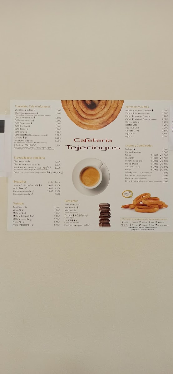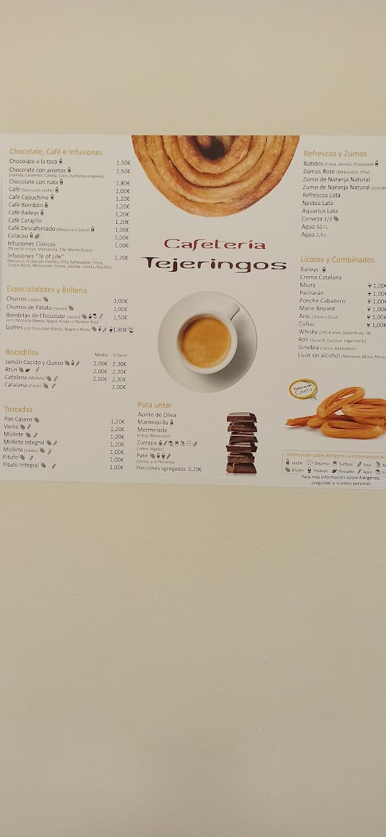 Cafetería Tejeringos in Ronda offers a charming menu with a variety of traditional Spanish treats, perfect for a casual meal or snack. The standout dish on the menu is the Chocolate Caliente Churros, a delightful and indulgent combination of crispy churros served with a rich, warm chocolate dipping sauce, making it a must-try for dessert lovers. For a savory option, the Mollete Dantequera offers a satisfying choice, featuring a traditional Andalusian bread roll filled with flavorsome fillings, a perfect blend of simplicity and taste. To complement the meal, the Coffee Descafeinado provides a smooth, decaffeinated coffee that pairs wonderfully with any dish. Whether you're in the mood for a sweet treat or a light bite, Cafetería Tejeringos’ menu serves up quality and comfort in every bite.
